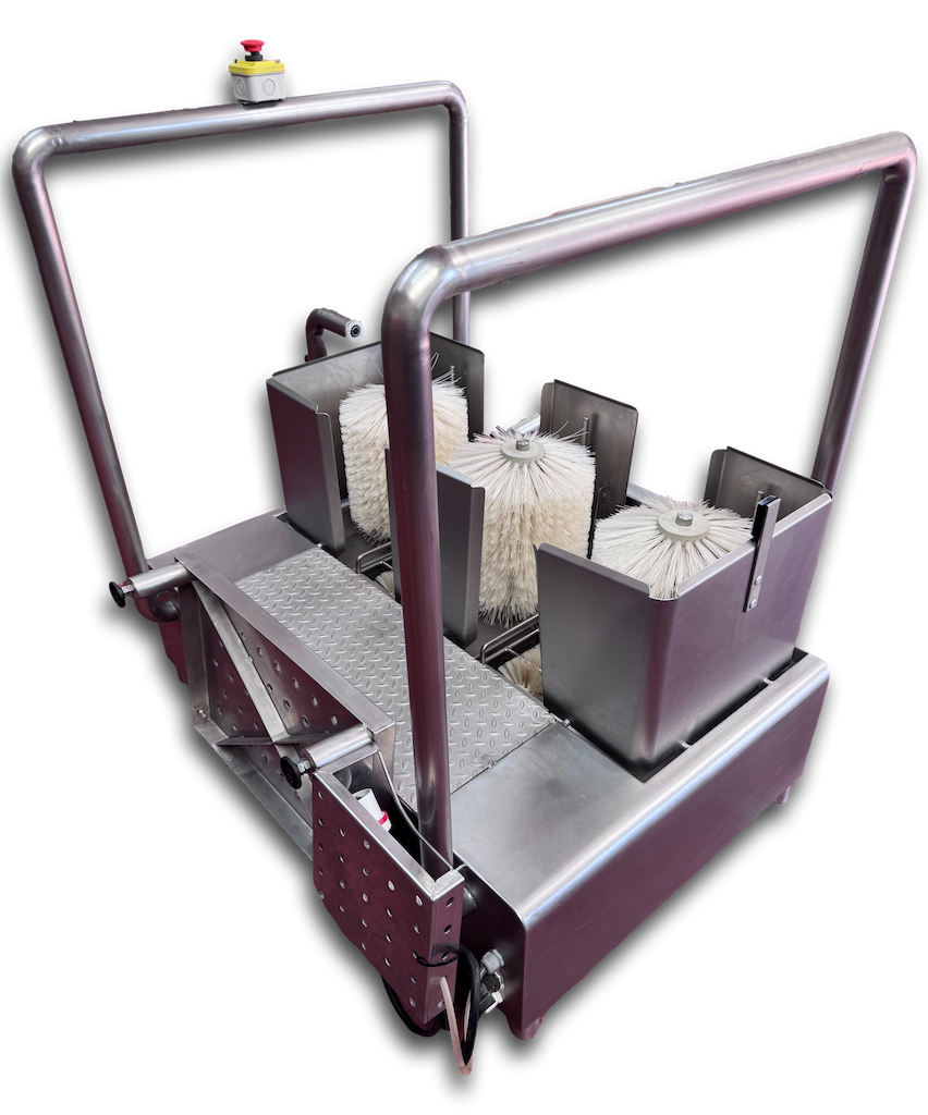 Walk through boot wash used in stainless steel. This walk through boot wash is designed for controlled hygiene entry into food production, abattoir, and processing environments.